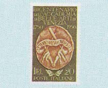 Bicentenario dell'Accademia delle Belle Arti di Venezia. Stampa in rotocalco in fogli di 50 (x 4). Filigr.