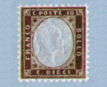 Riquadro tipografico. Disegno e stampa di Francesco Matraire - Torino. Effige in rilievo di Giuseppe Ferraris. Tipo di francobollo di Sardegna del