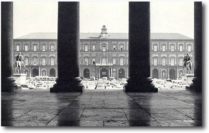 della collina di Posillipo. Ha forma regolare ed è limitata sul lato Est dalla lunga grandiosa facciata del palazzo Reale, in funzione del quale fu progettata a principio del secolo scorso. Il palazzo, eretto nei primi anni del Seicento da Domenico Fontana, ha subito rimaneggiamenti senza perdere tuttavia troppo di dignità. Sul lato di fronte al palazzo per tutta la larghezza della piazza si svolge ad emiciclo un monumentale portico su colonne trabeate, iniziato nel 1810 per ordine di Gioacchino Murat. |